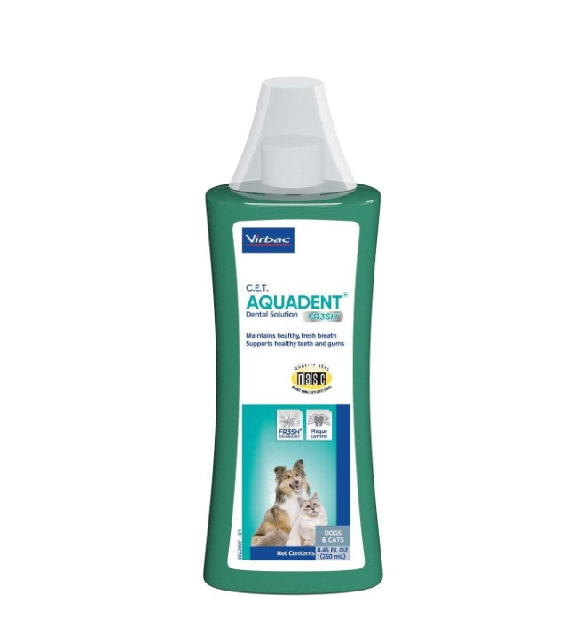 C.E.T. Aquadent FR3SH Dental Solution is recommended to help maintain fresh breath and support healthy teeth and gums by controlling plaque in dogs and cats. The formulation includes the following natural ingredients: