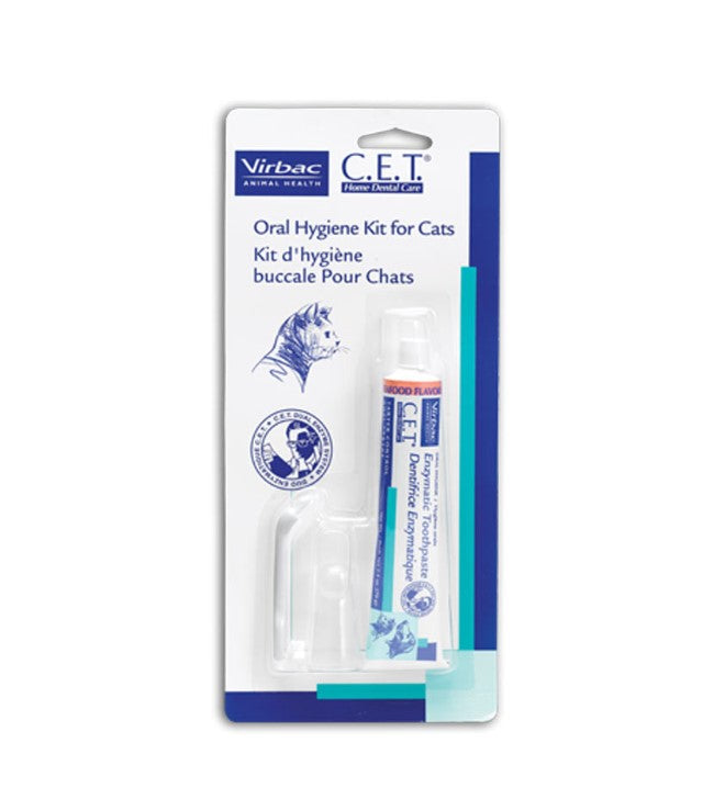 The perfect way to start a program of regular oral hygiene. Each kit contains 2.5 oz. (70 gram) seafood-flavored C.E.T. Tartar Control Toothpaste, a C.E.T. Fingerbrush, and a C.E.T. Cat Toothbrush.
