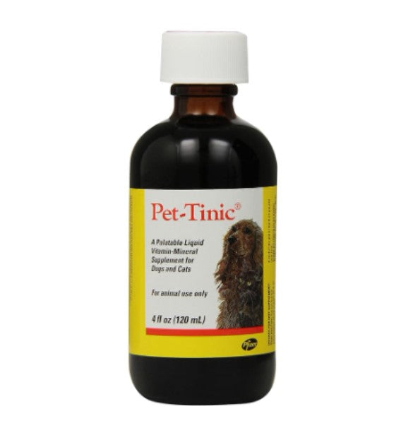 Pet-Tinic is a palatable, meat-flavored liquid vitamin-mineral supplement for dogs and cats that contains iron, copper and 5 essential vitamins.